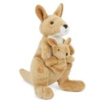 Prémium minőségű, Semo márkájú, 18 cm-es élethű világosbarna plüss kenguru kicsinyével, műanyag szemekkel.